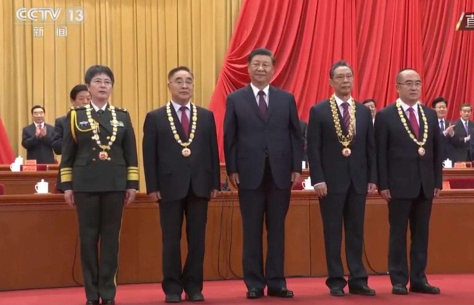 在全場(chǎng)熱烈的掌聲中,在人們崇敬的目光注視下,4位國家勛章和國家榮譽(yù)稱號(hào)獲得者受邀到主席臺(tái)就座。