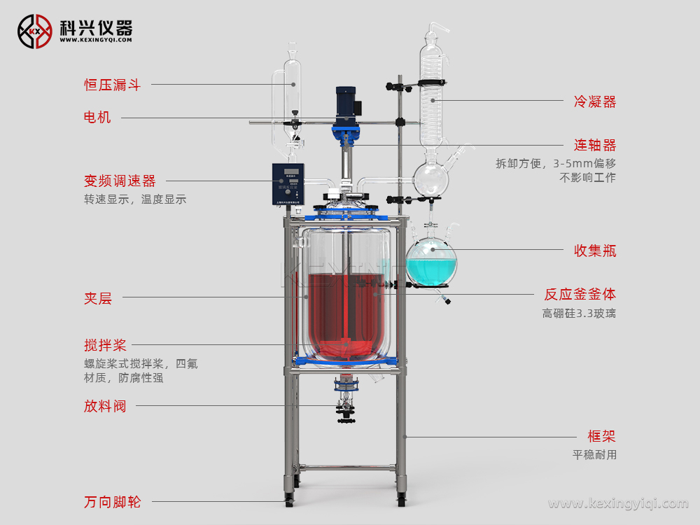 雙層玻璃反應(yīng)釜為雙層玻璃設(shè)計,內(nèi)層放入反應(yīng)溶媒可做攪拌反應(yīng),夾層可通上不同的冷熱源(冷凍液,熱水或熱油)做高溫反應(yīng)或低溫反應(yīng)。